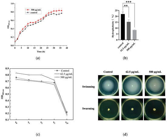 In addition, bacteria’s swimming ability was beneficial for the formation of biofilms, which was attributed to their ability to form cell clusters and aggregate on the surface of the matrix for movement. It was found that EPS715 could improve the strain’s swimming ability but had no effect on its swarming ability (Figure 6d). The increase in swimming ability would delay the formation of the biofilm and accelerate dispersion of the biofilm.