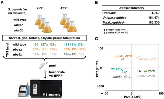 Experimental workflow, summary of the dataset, and principal component analysis. (A) Wild-type, ubc4Δ and ubc5Δ S. cerevisiae cells were grown in triplicate in the exponential phase (24 °C) or subjected to heat shock treatment (42 °C for 80 min). Cells were harvested and processed for mass spectrometry analysis. In brief, yeast cells were lysed, and total protein was extracted and digested. The subsequent peptides were labeled with tandem mass tag (TMTpro) reagents, as indicated, pooled 1:1, and fractionated by basic pH reversed-phase (BPRP) HPLC prior to mass spectrometry analysis. This panel has been assembled, in part, using Biorender.com. (B) Summary of the dataset. (C) Principal component analysis (PCA) of the dataset highlighting the clustering of the replicates.