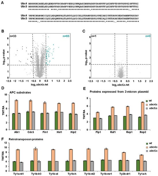 Proteome-wide profiling of differentially abundant proteins in exponentially growing ubc4Δ and ubc5Δ cells compared to wild-type cells and potential candidate substrates of Ubc4. (A) Protein sequence alignment of the two ubiquitin-conjugating enzymes Ubc4 and Ubc5. The volcano plots illustrate differentially abundant proteins (i.e., |log2 ratio| > 0.5 and p-value < 0.01) between (B) wild-type and ubc4Δ or (C) wild-type and ubc5Δ cells. p-values are uncorrected two-sided student t-tests. Proteins with abundance measurements that are higher in ubc4Δ cells are highlighted, such as (D) substrates of the Anaphase Promoting Complex (APC), (E) proteins expressed from the 2-micron plasmid, and (F) retrotransposon proteins. RA: relative abundance. Error bars represent the standard deviation between replicates for panel D through F. TMT RA, tandem mass tag relative abundance.