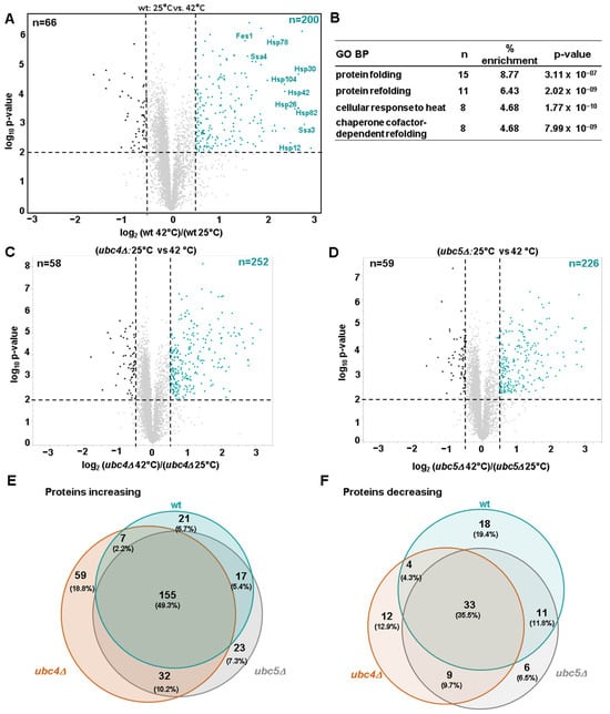 Proteome-wide profiling of differentially abundant proteins in wild-type, ubc4Δ and ubc5Δ after heat shock treatment. (A) The volcano plot illustrates differentially abundant proteins (i.e., |log2 ratio| > 0.5, and p-value < 0.01) in wild-type cells grown at 25 °C and after heat shock treatment (42 °C for 80 min). (B) The top gene ontology (GO) biological processes (BP) terms associated with the proteins increasing after heat shock treatment in wild-type cells. The volcano plots illustrate differentially abundant proteins (i.e., |log2 ratio| > 0.5, and p-value < 0.01) in (C) ubc4Δ cells and (D) ubc5Δ cells at 25 °C, and after heat shock treatment (42 °C for 80 min). The Venn diagrams show the overlap between the proteins (E) increasing and (F) decreasing in wt, ubc4Δ and ubc5Δ cells after heat shock. The Venn diagrams have been created using BioVenn [48].