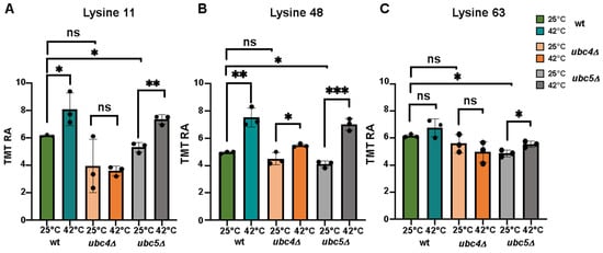Analysis of the lysine ubiquitin linkages following heat shock. Relative abundance (TMT RA) of the lysine ubiquitin linkages (A) Lys11, (B) Lys48, and (C) Lys43 (detected in the experiment during exponential growth at 25 °C and after heat shock treatment (42 °C) in the strains investigated. Statistical significance was calculated using a two-tailed unpaired t-test (ns = p > 0.05, * p-value < 0.05, ** p-value < 0.01, *** p-value < 0.001). Dot represents each replicate in that specific condition.