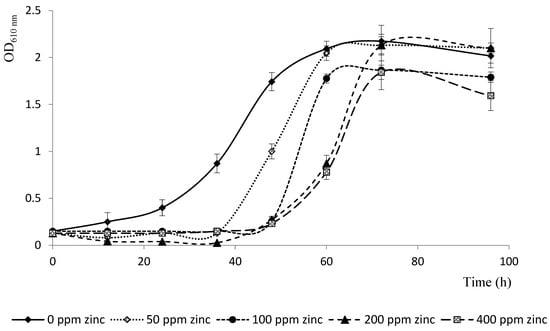Figure 1. Growth of B. subtilis in MSM with 55 mM L-glutamic acid, 1% glycerol, without Zn (control) and with different Zn concentrations at 30 °C and 150 rpm for 96 h. Values are means ± SD (n = 3).