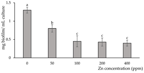 The biofilm produced by B. subtilis in a liquid medium with no Zn addition showed a well-defined and structured architecture, which was built up at the Erlenmeyer air/liquid interface (Figures S1 and S2, Supplementary Materials). Without Zn, the biofilm yield was 1.35 mg biofilm/mL of culture on a dry weight basis (Figure 2). However, biofilms produced in the presence of Zn accumulated at the bottom of the Erlenmeyer flask showed more disorganized structures compared to the control treatment. Moreover, the higher the metal concentration in the liquid media, the lower the amount of biofilm produced. Thus, at 50 ppm Zn, the biofilm amount decreased by about 50% relative to the control, while at 100, 200, and 400 ppm Zn, reductions of about 70% were recorded (Figure 2).