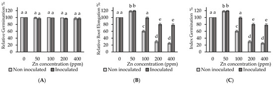 Harmful and beneficial Zn impacts, depending on the metal concentration, were also reflected in the germination index. In fact, RRE and GI results showed a close similarity (Figure 3B,C). Again, at 50 ppm Zn, GI values were significantly higher (p < 0.05) than those of the control treatment, so germination exhibited a safe response to this relatively low Zn concentration (Figure 3C). However, in the non-inoculated treatment with 100 ppm Zn, GI was 60% lower compared with the control treatment, which is considered moderate toxicity. Moreover, at 200 and 400 ppm, Zn GI values were about 30% and 25% lower relative to the control treatment, respectively, which corresponds to a high toxicity level.