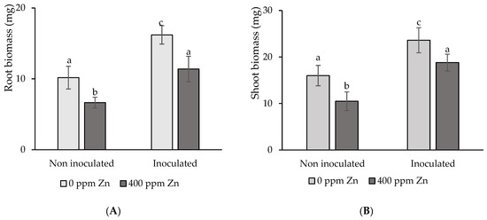 Figure 4. Impact of seed inoculation and 400 ppm Zn surplus on: (A) root and shoots (B) biomass of tomato plants after 4 months’ growth. Values are means ± SD (n = 10). Different letters indicate differences between treatments at the 0.05 probability level.