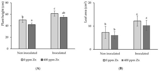 Figure 5. Impact of seed inoculation and 400 ppm Zn surplus on (A) plant height and (B) leaf area of tomato plants after 4 months’ growth. Values are means ± SD (n = 10). Different letters indicate differences between treatments at the 0.05 probability level.