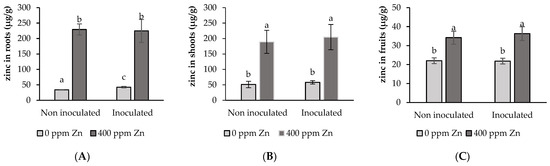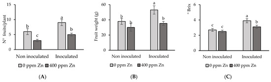 Zn surplus also negatively impacted fruit weight, as the treatment with extra metal exhibited a decrease of 21% with respect to the control treatment, even if this difference was not significantly (p < 0.05) different. However, inoculation increased fruit weight, which was 18% and 39% for plants growing on substrates with and without Zn addition, respectively, compared to the non-inoculated counterparts. The former differences were not significant (p < 0.05), while the latter showed significance at this probability level (Figure 6B).