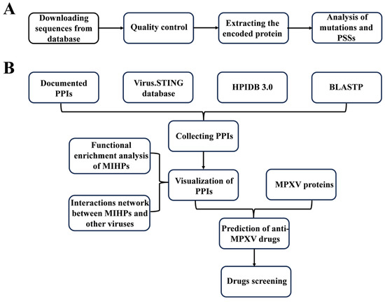 A schematic of the workflow of this study. (A) The analysis of mutations and PSSs within the MPXV genome. (B) Anti-MPXV drug screening. MPXV, mpox virus; PSSs, positive selection sites; PPIs, protein–protein interactions; MIHPs, MPXV-interacting human proteins.