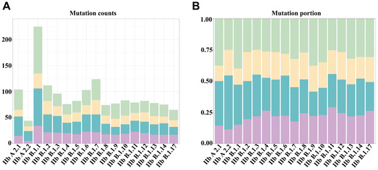 The nonsynonymous mutations and synonymous mutations in different lineages of MPXV. (A) The number of nonsynonymous mutations and synonymous mutations in the core and variable regions of the MPXV genome. (B) The proportion of nonsynonymous mutations and synonymous mutations in the core and variable regions of the MPXV genome. Green indicates nonsynonymous mutations in the core regions; yellow indicates synonymous mutations in the core regions; blue indicates non-synonymous mutations in the variable regions; purple indicates synonymous mutations in the variable regions.