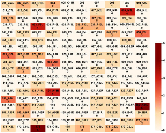 To further screen the sites under positive selection during evolution, we conducted a positive selection analysis of MPXV genes. A total of 40 PSSs in MPXV genes were detected. The genes encoding these proteins are C19L, NBT03_gp004, NBT03_gp006, NBT03_gp008, C5L, N2L, M2L, F3L, F5L, F6L, F12L, E2L, E7R, G6R, G7L, G9R, D1R, D8L, A3L, A4L, A17L, A26L, A35R, A43R, A44L, B4R, B6R, B20R, NBT03_gp173, and NBT03_gp176. Among them, G7L exhibited the highest number of PSSs (Figure 3). Furthermore, compared to the first clade in the 2022 outbreak, 20 (50%) non-synonymous mutations were observed in the PSSs, including E28V in C5L, N43L in E7R, and N44F in E7R.