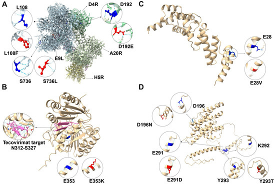 - Garrigues, J.M.; Hemarajata, P.; Karan, A.; Shah, N.K.; Alarcón, J.; Marutani, A.N.; Finn, L.; Smith, T.G.; Gigante, C.M.; Davidson, W.; et al. Identification of Tecovirimat Resistance-Associated Mutations in Human Monkeypox Virus—Los Angeles County. Antimicrob. Agents Chemother. 2023, 67, e0056823. [Google Scholar] [CrossRef]