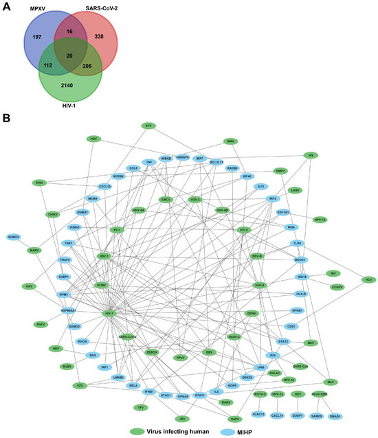 MIHPs interact with other viruses infecting humans. (A) Venn diagram of human proteins interacting with MPXV, SARS-CoV-2, and HIV-1. A total of 36 MIHPs interacting with SARS-CoV-2, 132 MIHPs interacting with HIV-1, and 20 MIHPs interacting with both SARS-CoV-2 and HIV. (B) The interaction network between MIHPs and other viruses infecting humans. A total of 159 MIHPs interacted with other viruses, and 60 MIHPs interacted with more than one virus. MIHP, MPXV-interacting human proteins.