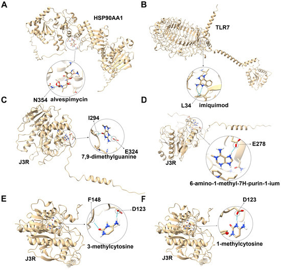 After screening, alvespimycin and imiquimod were predicted to be anti-MPXV drugs targeting MIHPs. Additionally, 7,9-dimethylguanine, 6-amino-1-methyl-7H-purin-1-ium, 3-methylcytosine, and 1-methylcytosine were predicted as anti-MPXV drugs targeting MPXV proteins. Alvespimycin formed one hydrogen bond with the N354 of HSP90AA1 (Figure 6A), while imiquimod formed one hydrogen bond with the L34 of TLR7 (Figure 6B). 7,9-Dimethylguanine established one hydrogen bond with the I294 and E324 of J3R (Figure 6C). 6-Amino-1-methyl-7H-purin-1-ium formed one hydrogen bond with E278 of J3R (Figure 6D). 3-Methylcytosine bonded to J3R through a hydrogen bond at D123 and F148 (Figure 6E). Finally, 1-methylcytosine was bonded to J3R through a hydrogen bond at D123 (Figure 6F).