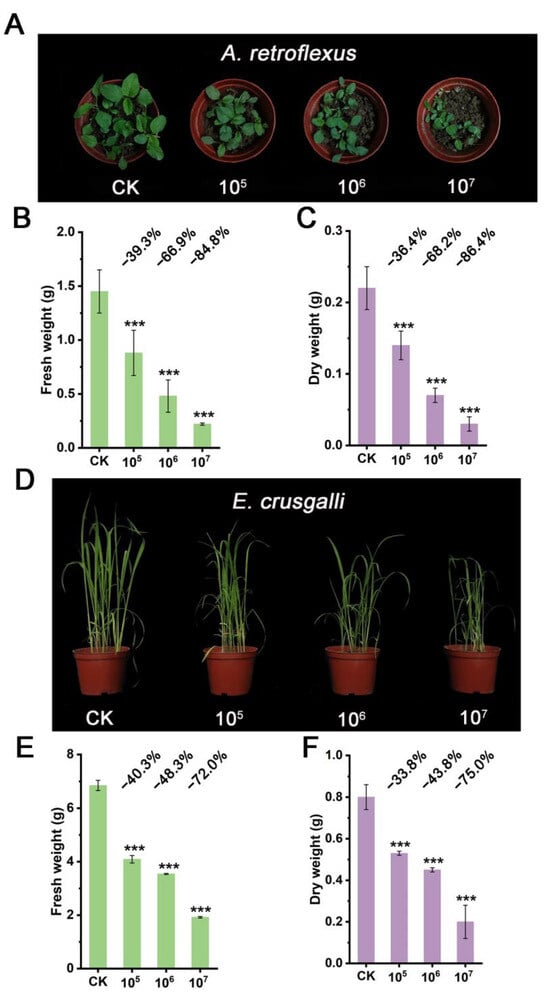 To further confirm the herbicidal activity of this strain, we conducted pot experiments using A. retroflexus and E. crusgalli as test weeds. Two methods, spore mixing with soil and foliar spray, were employed for testing. The results showed similar effects for both methods. Herbicidal activity was positively correlated with spore concentration (Figure 4A,B and Figure S1A,B). At a spore concentration of 107 CFU/mL or 107 CFU/g in soil, compared to the control group, A. retroflexu exhibited a reduction of more than 80% in both fresh weight and dry weight (Figure 4C,D and Figure S1C,D), while E. crusgalli showed reductions of over 70% in fresh weight and over 60% in dry weight (Figure 4E,F and Figure S1E,F). These results indicate the potential of this strain to be developed into a bioherbicide.