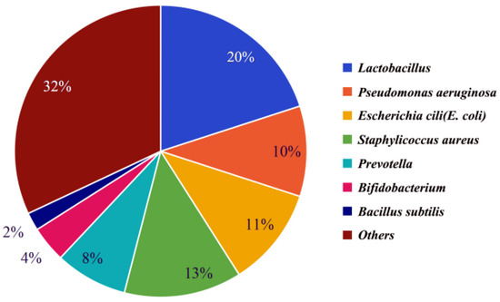 Semen makes up 90% of the volume of ejaculated semen and consists of secretions from the epididymis, prostate, seminal vesicles, urethral bulbourethral glands, and periurethral glands [19,20]. It has been found that semen from different parts of the reproductive tract contains the same dominant bacteria, but the abundance of the various dominant bacteria varies slightly, possibly due to the fact that different parts of the reproductive tract contain slightly different abundances of the various bacteria. The microbiota of male testicular samples [21], seminal vesicle samples [22], and prostate samples [23] were analyzed separately, and it was found that all three had the same dominant bacteria: Lactobacillus, Pseudomonas, Escherichia coli, and Staphylococcus aureus, but the dominant bacteria had slightly different abundances in different samples. Through these studies, it was found that these dominant bacteria were also the dominant bacteria in semen, and their abundance in semen is shown in Figure 1 [24,25,26,27].
