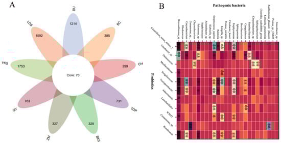 The bacterial species and abundance correlation in boar semen. (A) A Venn diagram of 2783 bacterial species from 9 breed boars. (B) The abundant correlation between top-11 probiotics and top-26 pathogenic bacteria. YKS: Yorkshire, LDS: Landrace, DU: Duroc, BKS: Berkshire, TOP: Topek boar, ZM: Zangmei, QY: Qingyu boar, CH: Chenghua boar, BC: Bacheng boar. * significant correlation (p < 0.05), ** extremely significant correlation (p < 0.01).