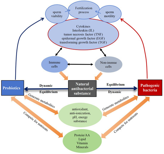 Immunological, reproductive, genetic, and endocrine factors significantly influence the equilibrium of the bacterial microecosystem [14,15,16], regulating the microbial community in semen through different mechanisms (Figure 6). Probiotics exhibit antimicrobial properties by releasing metabolites with properties like antioxidant, anti-inflammatory, pH-regulating, and energy-influencing that directly hinder the growth and proliferation of pathogenic bacteria [107]. At the same time, cytokines produced by immune and non-immune cells within the body have an impact on sperm quality and quantity. For example, pro-inflammatory cytokines like interleukin (IL)-1, IL-6, IL-8, and tumor necrosis factor (TNF)-α may adversely affect spermatogenesis and sperm function [108], and transforming growth factor (TGF)-β is involved in the regulation of cell proliferation and differentiation and influences spermatogenesis and maturation [109]. Additionally, cytokines also modulate natural antimicrobial substances so that they can effectively exert antimicrobial and bactericidal roles, and inhibit the harmful effects of pathogenic bacteria along with probiotics [110,111]. Nutrients, like proteins [112], amino acids [112], lipids [113], vitamins [114], and minerals [115], also play a role in maintaining the dynamic equilibrium among probiotics, pathogenic bacteria, and natural antimicrobial substances.