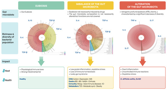 Illustration of the differences between gut microbiome eubiosis, imbalance, and dysbiosis.