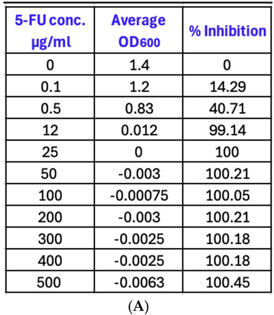 Efficacy of different concentrations of 5-fluorouracil on the growth of PAO1. (A) Average OD600 reading and % inhibition of 5-fluorouracil concentrations ranging from 0 to 500 µg/mL; (B) % inhibition of bacterial growth at different concentrations of 5-fluorouracil. The potency of the drug decreased significantly at concentrations below 0.5 µg/mL, while it remained above 95% at concentrations of 12 µg/mL and above. Data points represent the mean values of at least 3 replicates. For all concentrations, there was a significant decrease in growth with a p value of 0.0044 (p < 0.05) for a concentration of 0.1 µg/mL and p < 0.0001 for concentrations of 0.5 to 500 µg/mL.