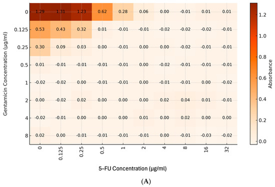 Heatmap displaying the OD600 readings from a checkerboard assay in a 96-well plate (horizontal axis, µg/mL) and gentamicin (vertical axis, 0–8 µg/mL). A darker color represents a higher increase in absorbance, which corresponds to increased bacterial growth. The FICI was calculated from each drug with the MIC (the lowest concentration of the drug showing 80% inhibition). (A) Combined treatment of gentamicin and 5-fluorouracil indicated synergy with an IFCI value of 0.31. (B) Combined treatment of meropenem and 5-fluorouracil indicated an additive effect with an FICI value of 0.56.