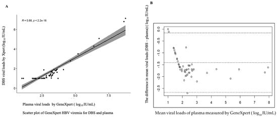 Comparison and correlation of DBS and plasma paired samples using scatter and Bland–Altman plots of detectable viral loads by GeneXpert HBV DNA test. (A) Linear regression of 34 paired DBS–plasma samples with detectable viral loads by GeneXpert. (B) Bland–Altman plot analysis of GeneXpert viral load of DBS minus plasma viral loads (vertical axis) against GeneXpert viral load mean of DBS and plasma viral loads (horizontal axis); mean difference of 1.831 at limits of agreement of 0.660 to 3.001; the average lies between log10 IU/mL 1.151 and 6.311 and 11.76% of the data are outside of the limits of agreement. Samples that had numerical results by both methods are presented (n = 34).