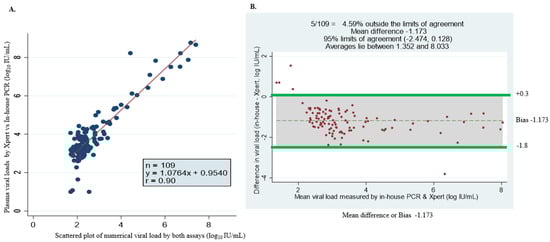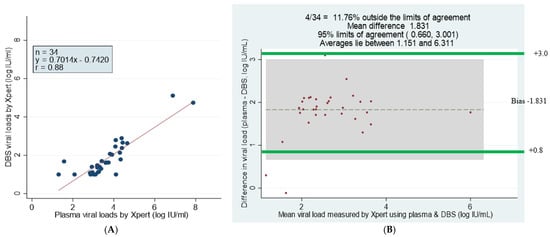 The scatter plot analysis of 34 GeneXpert plasma and DBS samples with viral loads showed a correlation of r = 0.88 and Y = 0.7014x − 0.7420 log10 IU/mL (Figure 5A). The Bland–Altman statistical analysis showed that 11.76% of samples fell outside the limits of agreement, with a mean difference of 1.831 Log10 IU/mL. The difference was significant at 95% limits of agreement +0.660 to 3.001 Log10 IU/mL, and the bias was smaller for samples with lower viral loads (Figure 5B) (Table 5).