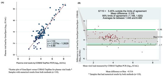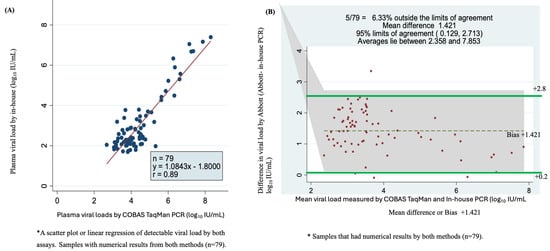 Of the 116 quantifiable samples by in-house qPCR and 129 samples by COBAS TaqMan assay with numerical results, 79 samples had detectable viral load according to the two assays. A scatter plot of in-house qPCR versus COBAS TaqMan for these viral loads showed a correlation of r = 0.89 with a Y = 1.0843x − 1.800 (Figure 4A). The plot showed a higher correlation for samples with high viremia than those with lower viral load. The Bland–Altman plot showed that 6.33% were outside the limits of agreement, with a mean bias or difference of 1.421. The bias was statistically significant, with 95% limits of agreement of +0.129 to +2.713 log10 IU/mL. The viral load mean was between 2.358 and 7.853 log10 IU/mL (Figure 4B).