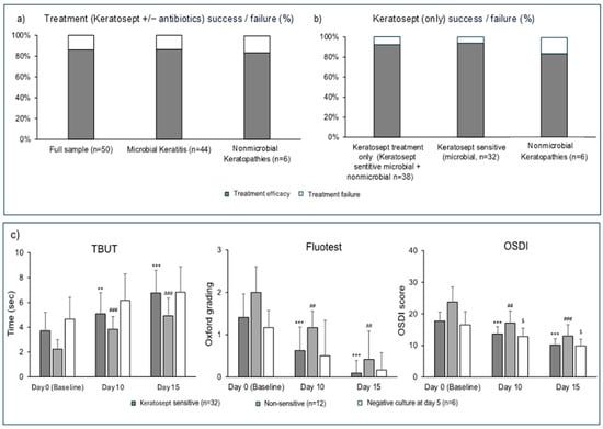 (a) Treatment success (either Keratosept® alone or in combination with targeted antibiotics) in the overall sample (n = 50) and by microbial (n = 44) and nonmicrobial (n = 6) keratopathies. (b) Treatment success proportions in cases treated with Keratosept only and by Keratosept®-sensitive and nonmicrobial keratopathies. (c) A longitudinal evolution of the fluorescein dye staining test (Fluotest), the tear break-up time test (TBUT), and the ocular surface disease Index (OSDI) questionnaire by subgroups. *** p < 0.001 and ** p < 0.01 vs. the previous time point within the “Keratosept®-sensitive” group. ### p < 0.001 and ## p < 0.01 vs. the previous time point within the “Non-sensitive” group; $ p < 0.05 vs. the previous time point within the “Negative culture at day 5” group; Mann–Whitney non-parametric test.
