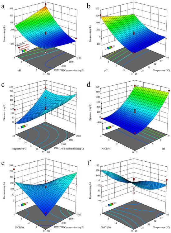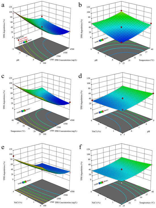 The degradation of TPHs and the growth (biomass) of strain 2021 were expressed as response values with the changes in TPH concentration, temperature, pH, and NaCl content in two-factor ways. The results showed that the degradation of TPHs was found to increase with the increase in pH, from 38.81–46.79% at pH 5 to 60.86–~100% at pH 9 (