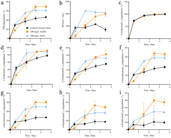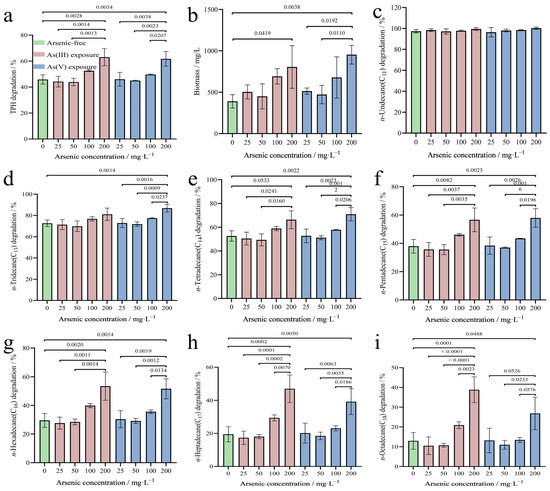 Figure 3c–i). It is of particular importance to note that the degradation-promoting effect of arsenic on strain 2021 was found to be significantly enhanced with the prolongation of the