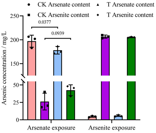 Figure 4a), and the biomass of the strain reached 445.00 ± 43.20 mg/L (As-free group), 1126.67 ± 20.95 mg/L (As