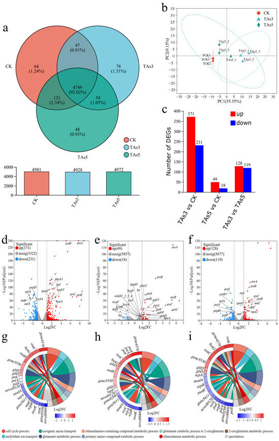 Figure 6a). The number of specifically transcribed genes in the CK, TAs3, and TAs5 groups was 64, 78, and 48, accounting for 1.24%, 1.51%, and 0.93% of the total genes, respectively (