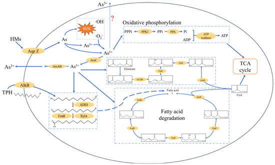 24]. Interestingly, strain 2021 could efficiently degrade TPHs under the combined pollution of TPHs and arsenic. Furthermore, it is noted that arsenic could significantly promote the degradation of TPHs, with trivalent arsenic promoting slightly better than pentavalent arsenic. Studies on the effects of HMs on microbial metabolism have shown that metabolic pathways such as lipid metabolism, aromatic metabolism and transporter proteins/pumps are enhanced with increasing HMs concentrations [