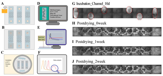 2 PDMS as cover to reduce evaporation. To minimize the solution evaporation during the 10-day incubation, damp tissues were added to the devices or replenished periodically. The Petri dishes with the devices were covered with a lid and sealed with a 2-layer parafilm to prevent contamination and dehydration during incubation. All the treatments were conducted in triplicates. Fungal growth in the channels was monitored to confirm its hydration status using a Nikon inverted Ti-U microscope (Nikon, Melville, NY, USA) with a 10× objective under an EpiLight source. A detailed scheme of microfluidics applications and an example image are illustrated in