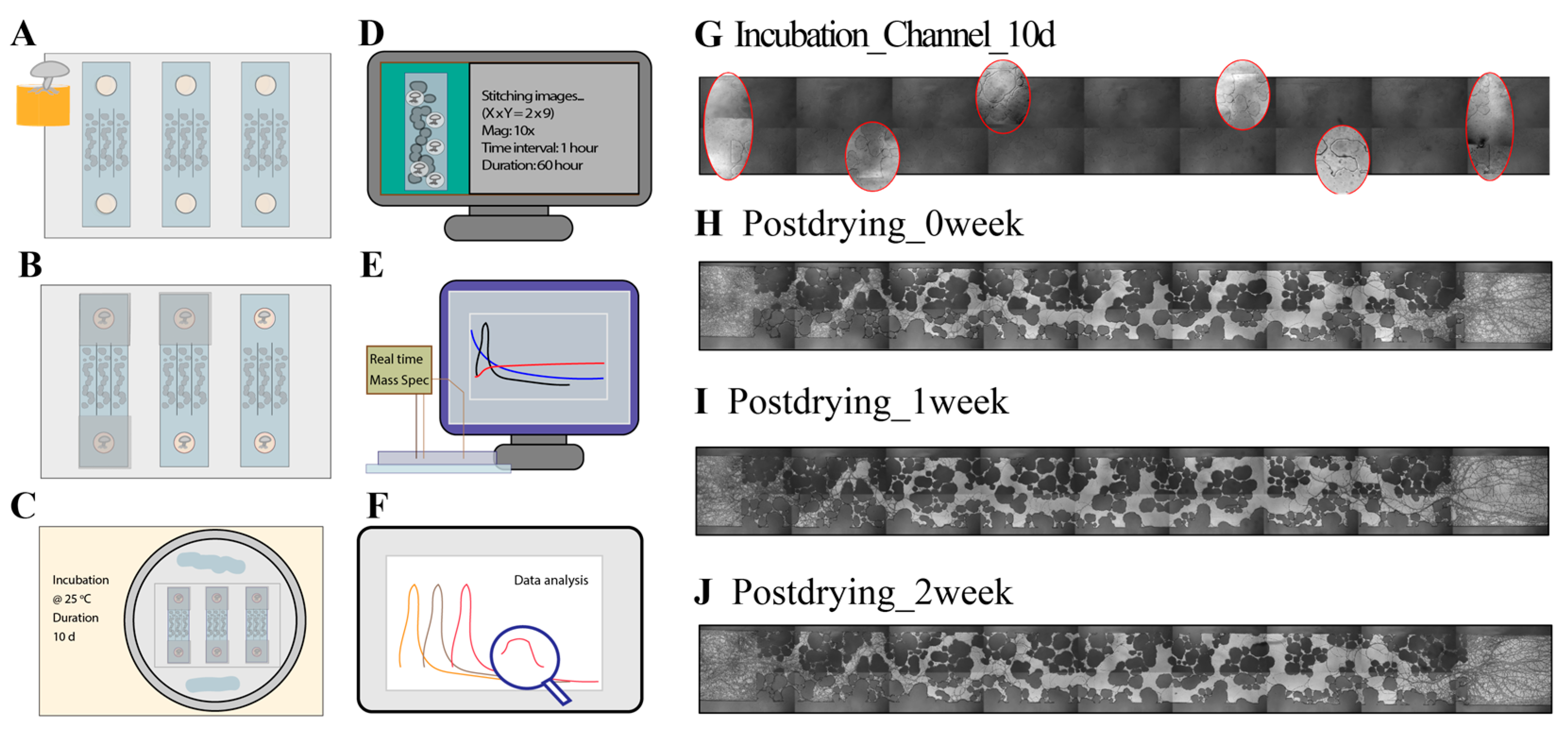 Workflow of this study and example images from monitoring. (A) Fungal inoculation into microfluidics. (B) Microfluidics covered with a PDMS square. (C) Incubation at 25 °C for 10 days. (D) Monitoring of drying experiments from microfluidics. (E) RTMS monitoring during rewetting of microfluidics. (F) RTMS data analysis. (G) Example images of fungi inoculated within microfluidics. The completely dark channel indicates full saturation after 10 days of incubation. The circled area highlights fungal movement within the geometry. (H) Example channel image of a 0-week dry sample. (I) Example channel image of a 1-week dry sample. (J) Example channel image of a 2-week dry sample.