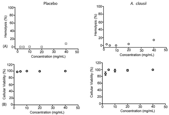 Hemolytic activity was measured by hemoglobin release (HR) as described by Lefevre et al. [54]. Briefly, human blood obtained from healthy volunteers was centrifuged (3000× g for 5 min) to isolate the erythrocytes. The suspension of fresh erythrocytes obtained was washed and resuspended in 1 mL of buffered phosphate solution (PBS). The concentration of the suspension was adjusted by adding PBS to obtain an absorbance of 0.7 at 490 nm, obtained by adding 1 mL of the standard to 14 mL of distilled water. For the hemolysis test, different concentrations of the compound to be tested were added to the erythrocytes. After 1 h of incubation at room temperature, the samples were centrifuged, and the supernatant was added to the wells of a 96-well polystyrene. The supernatant of erythrocytes in PBS1X was used as a negative control, and the supernatant of erythrocytes in distillate water was employed as a positive control.
