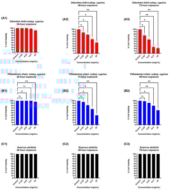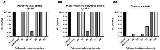 4.3. Broth Microdilution Antibacterial-Susceptibility Test of O. linkii subsp. cyprius, P. cham. subsp. cyprius, and Q. alnifolia