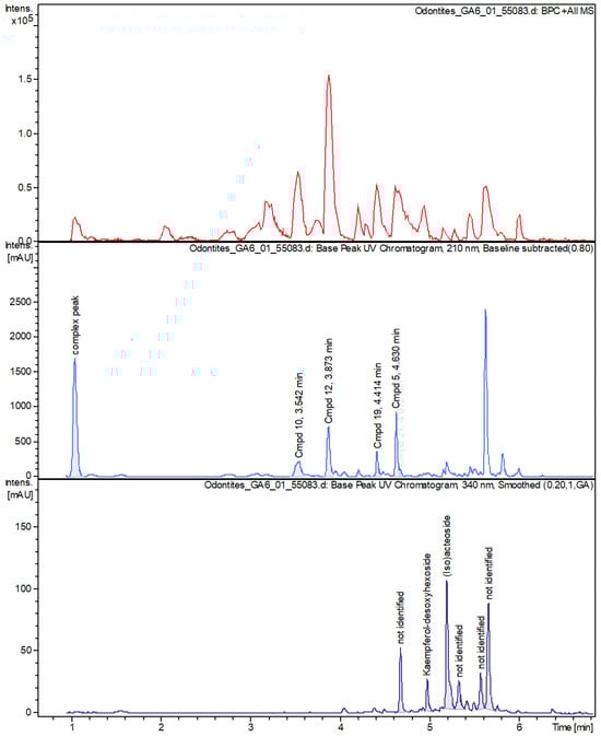 - Frezza, C.; De Vita, D.; Venditti, A.; Baldani, C.; Giampaoli, O.; Sciubba, F.; Dal Bosco, C.; Franceschin, M.; Beccaccioli, M.; Reverberi, M. Phytochemical analysis and biological activities of the aerial parts of Odontites vulgaris Moench. Fitoterapia 2024, 175, 105936. [Google Scholar] [CrossRef]