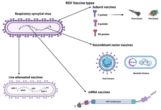 RSV vaccine types in clinical trials and approved for use. There are different RSV vaccine types: subunit vaccines, recombinant vector vaccines, live attenuated vaccines, and mRNA vaccines. Three RSV proteins, F, G, and SH, were tested in the subunit vaccine approach. The F protein-based vaccines used two different F protein conformations, post-fusion and pre-fusion. The RSV vaccines approved for use in the elderly and pregnant are subunit and mRNA vaccines based on the pre-fusion conformation.