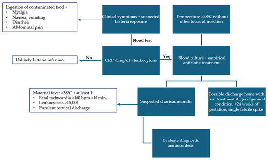 As previously stated, the range of maternal symptoms associated with listeriosis is extensive, encompassing those who are asymptomatic to those who present with influenza-like symptoms [5]. Our results demonstrated that the most prevalent symptoms among the mothers were fever and abdominal discomfort. Notably, there were no documented cases of neurolisteriosis or severe maternal sepsis. In view of the inherent complexity of diagnosing this infection, coupled with its non-specific clinical manifestations and low incidence, we have devised a potential diagnostic algorithm, which is presented in Figure 1. The objective of this algorithm is to facilitate an early diagnosis, primarily based on initial suspicion due to potential maternal food exposure, gastrointestinal symptoms, or the presence of fever. Such suspicion is corroborated by supplementary tests, including maternal blood cultures and determination of proinflammatory parameters at blood tests. The correct suspicion of Listeria chorioamnionitis allows for the early commencement of antibiotic therapy.