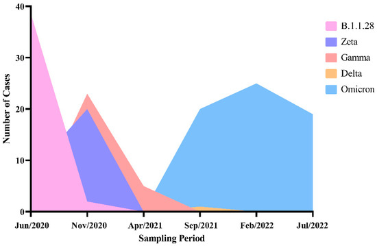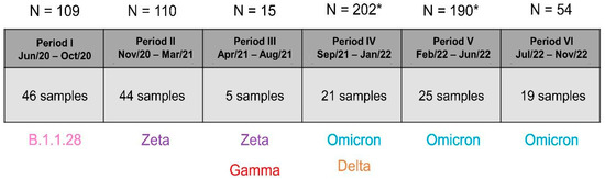 - Alcantara, L.C.J.; Nogueira, E.; Shuab, G.; Tosta, S.; Fristch, H.; Pimentel, V.; Souza-Neto, J.A.; Coutinho, L.L.; Fukumasu, H.; Sampaio, S.C.; et al. SARS-CoV-2 Epidemic in Brazil: How the Displacement of Variants Has Driven Distinct Epidemic Waves. Virus Res. 2022, 315, 198785. [Google Scholar] [CrossRef] [PubMed]