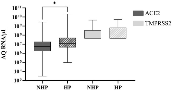 - Grisard, H.B.d.S.; Schörner, M.A.; Barazzetti, F.H.; Wachter, J.K.; Valmorbida, M.; Wagner, G.; Fongaro, G.; Bazzo, M.L. ACE2 and TMPRSS2 Expression in Patients before, during, and after SARS-CoV-2 Infection. Front. Cell Infect. Microbiol. 2024, 14, 1355809. [Google Scholar] [CrossRef]