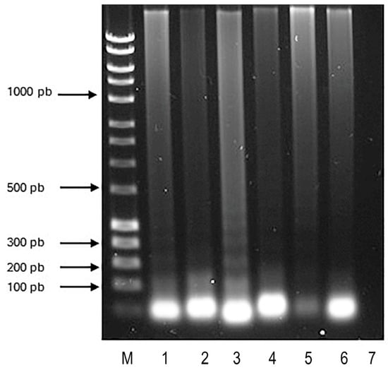 Serial dilutions were performed starting from an initial concentration of 30 ng/µL of P. aeruginosa DNA to determine the sensitivity of the LAMP and PCR techniques. The limit of detection (LOD) for the LAMP technique was 3 × 10−3 ng/µL or 0.003 ng/µL (Figure 2). PCR amplification of both the ecfX (528 bp) and 16s ribosomal RNA (216 bp) genes showed a LOD of 3 × 10−2 ng/µL or 0.03 ng/µL (Figure 2). The same sensitivity results were observed when using clinical samples. These results indicate that the LAMP technique is a thousand times more sensitive than the PCR technique. The specificity of the technique was evaluated using DNA from E. coli, S. aureus, K. pneumoniae, A. baumannii, P. mirabilis, E. cloacae, P. aeruginosa ATCC 27853, P. flavescens, P. resinovorans, P. stutzeri, P. putida, P. oryzihabitans, P. fluorescens, P. chlororaphis aureofaciens, P. tolaasii, and P. marginalis. The DNA electrophoretic revealed only amplification products in reactions containing P. aeruginosa DNA, suggesting that the technique is specific for its detection (Figure 3).
