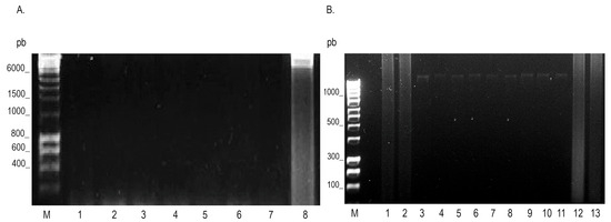 Specificity analysis of the LAMP technique for the detection of P. aeruginosa. The 1.2% electrophoresis gel stained with Red Gel ® (Biotium, Hayward, CA, USA). (A) Determination of the specificity of the LAMP assay for the amplification of the 16s rRNA gene of P. aeruginosa with DNA ESKAPE group. Lane M, 1 kb molecular weight marker; Lane 1, negative control, amplified from LAMP without DNA; Lane 2, DNA of K. pneumoniae; Lane 3, DNA of E. coli; Lane 4, DNA of S. aureus; Lane 5, DNA of E. cloacae; Lane 6, DNA of P. mirabilis; Lane 7, DNA of A. baumannii; Lane 8, DNA of P. aeruginosa ATCC 27853. (B) Determination of the specificity of the LAMP assay for the amplification of the 16s rRNA gene of P. aeruginosa with the species Pseudomonas group. Lane M, 1000 pb molecular weight marker; Lane 1, negative control, amplified from LAMP without DNA; Lane 2, is a positive control of 30 ng/µL of the reference strain ATCC 27853 of P. aeruginosa; Lanes 3, 13, and 14, are DNA of P. aeruginosa obtained from a clinical sample; Lane 4, DNA of P. flavescens; Lane 5, DNA of P. resinovorans; Lane 6, DNA of P. stutzeri; Lane 7, DNA of P. putida; Lane 8, DNA of P. oryzihabitans; Lane 9, DNA of P. fluorescens; Lane 10, DNA of P. chlororaphis aureofaciens; Lane 11, DNA of P. tolaasii; Lane 12, DNA of P. marginalis.