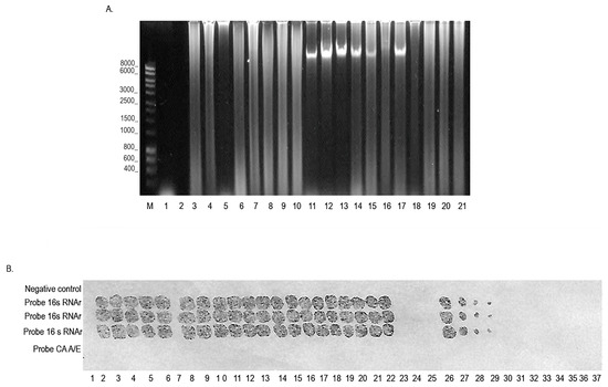 RLBH-LAMP assay for P. aeruginosa detection. Byodine C nylon membrane with the biotinylated P. aeruginosa 16s rRNA probe, revealed with Streptavidin HRP and (A) electrophoresis gel on 1.2% staining with Red Gel ® (Biotium, Hayward, CA, USA). (A) LAMP assay for the detection of P. aeruginosa DNA obtained from cultures of clinical samples. Lane M, 1 kb molecular weight marker; Lane 1, negative control, amplified from LAMP without DNA; Lane 2, X; Lane 3–20, P. aeruginosa DNA obtained from cultures of clinical samples; Lane 21, is a positive control of the reference strain ATCC of P. aeruginosa. (B) Lanes 1, 7, and 37: negative control, amplified from LAMP without DNA; Lane 2: LAMP amplified from the DNA of P. aeruginosa strain reference ATCC; Lane 3–6 and 8–22, LAMP amplified from P. aeruginosa DNA clinical samples; Lane 23, LAMP with DNA of K. pneumoniae, as a negative control; Lane 24, LAMP with DNA of S. aureus, as a negative control; Lane 25, LAMP with DNA of P. mirabilis, as a negative control. Lanes 26–31, serial dilutions from 3 × 10−1 ng/µL to 3 × 10−5 ng/µL of DNA concentration of the reference P. aeruginosa strain ATCC. Lanes 32 to 36, LAMP with DNA of E. coli serial dilutions from 3 × 10−1 ng/µL to 3 × 10−5 ng/µL. Lane 37, without sample.