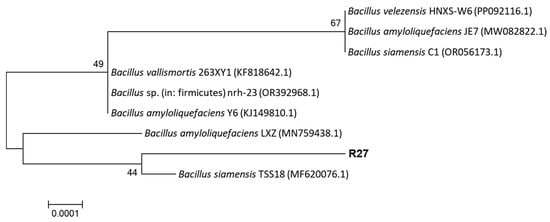 Genomic DNA was extracted from the R27 strain using a Bacterial Genomic DNA Extraction Kit (Solarbio®, Beijing, China) following the manufacturer’s instructions. Molecular identification was conducted by amplifying the 16S rRNA gene with universal primers 27F (5′-AGAGTTTATCCTGGGCTCAG-3′) and 1492R (5′-GGTTACCTTGTTACGACTT-3′), as described in [27]. The PCR reaction mixture, with a total volume of 50 µL, comprised 5 μL of 10 × Ex Taq Buffer, 2 μL of Ex Taq polymerase, 2.5 μL of 27F, 2.5 μL of 1492R, 2 μL of DNA template, and 36 μL of ddH2O. The amplification conditions were as follows: an initial denaturation step at 95 °C for 5 min, followed by 30 cycles of denaturation at 95 °C for 30 s, annealing at 55 °C for 30 s, and extension at 72 °C for 2 min, concluding with a final extension phase at 72 °C for 5 min. The PCR products were sent to Sangon Biotech (Shanghai) Co., Ltd. (Shanghai, China) for sequencing. The obtained sequences were then aligned with those in the NCBI database (https://blast.ncbi.nlm.nih.gov/Blast.cgi), and a phylogenetic tree for the R27 strain was constructed using MEGA7.0 software with the maximum likelihood method.