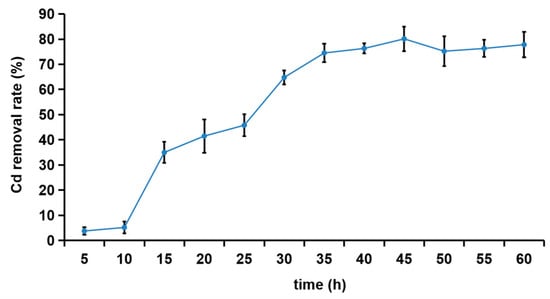 As shown in Figure 2, the removal rate of Cd2+ by the R27 strain gradually increased from the 10th h to the 45th h, ultimately reaching a maximum of 80.1% at the 45th h. Following this peak, the removal rates began to stabilize. The relatively low removal rate of Cd2+ observed during the initial 10 h might be attributed to the R27 strain being in the lag and early logarithmic growth phases (Figure S1), during which the bacterial population remained relatively low, resulting in a correspondingly lower adsorption of Cd2+.