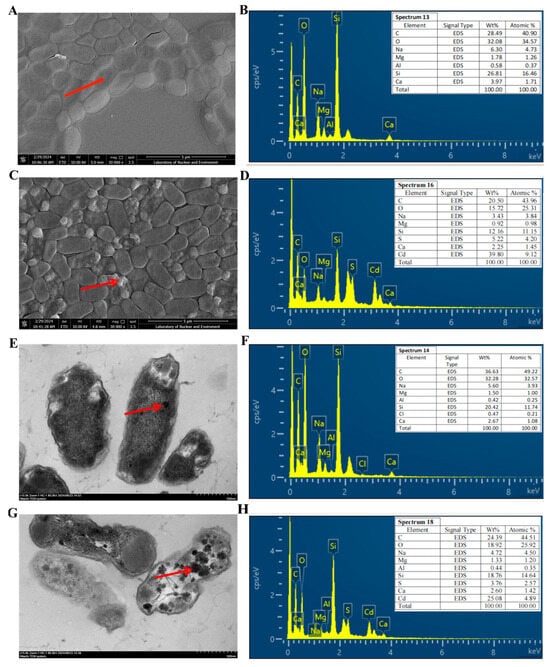 SEM and TEM images and EDX elemental analysis of R27 strain under non-Cd and Cd stress conditions. (A,B) SEM image and EDX spectrum of R27 under non-Cd stress condition; (C,D) SEM image and EDX spectrum of R27 under Cd stress condition; (E,F) TEM image and EDX spectrum of R27 under non-Cd stress condition; (G,H) TEM image and EDX spectrum of R27 under Cd stress condition. The red arrows indicated the marking selection point for spectrum analysis.