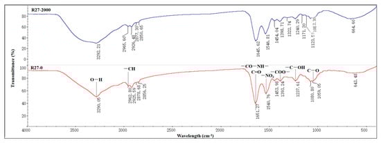 FTIR was employed to investigate the functional groups crucial for Cd absorption by the R27 cell surface. The R27 strain was cultured in an LB liquid medium with Cd concentrations of 0 mg/L and 2000 mg/L for a duration of 60 h at 37 °C, with stirring at 200 rpm. After centrifugation, R27 cells were harvested, vacuum-dried into a powder, and subsequently compressed into tablets at a 1:100 ratio for sample preparation. FTIR analysis was conducted using a Nicolet ls10 infrared spectrometer (ThermoFisher, Munich, ND, USA) according to the method of Iqbal et al. [30].
