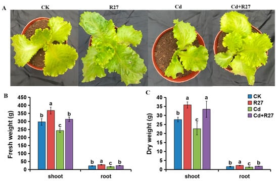 Effects of the R27 strain on the growth of lettuce seedlings under non-Cd and Cd stress conditions. (A) Lettuce seedling growth characteristics; (B) the fresh weights of lettuce; (C) the dry weights of lettuce. Blue, red, green, and purple bars represent CK (water only), R27 (R27 inoculation alone), Cd (Cd stress only), and Cd + R27 (Cd stress in combination with R27 inoculation) treatments, respectively. Different letters indicate statistically significant differences between the four treatments (Duncan’s multiple range tests, p < 0.05; n = 45, mean ± standard deviation).